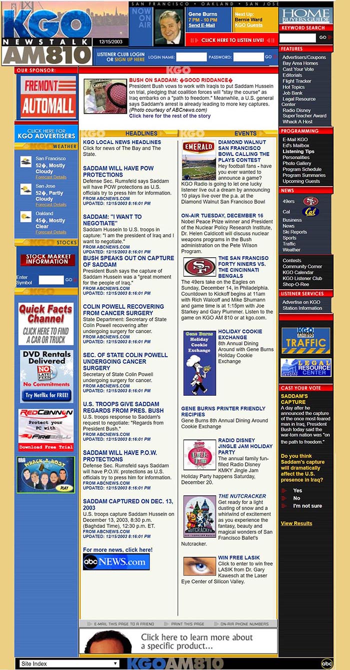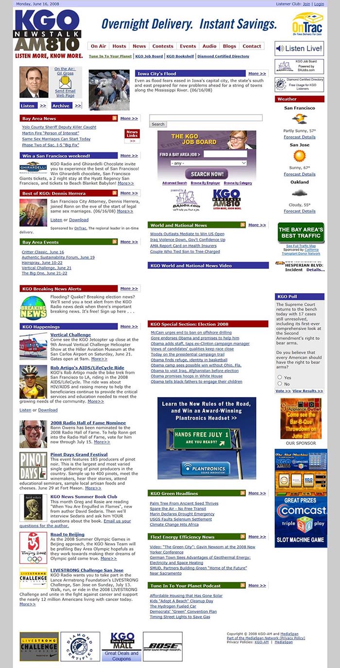 During my 10 years at ABC Radio San Francisco, KGO's website was redesigned six times. Below are the last three that I mocked up and had developed. The top being the last site I worked on.